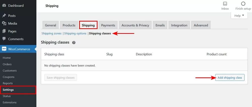 进入WooCommerce > Settings > Shipping > Shipping Classes,然后点击Add shipping class。