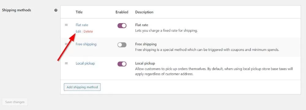 在下一页,向下滚动到Shipping methods部分,并点击Flat rate方法下的Edit。