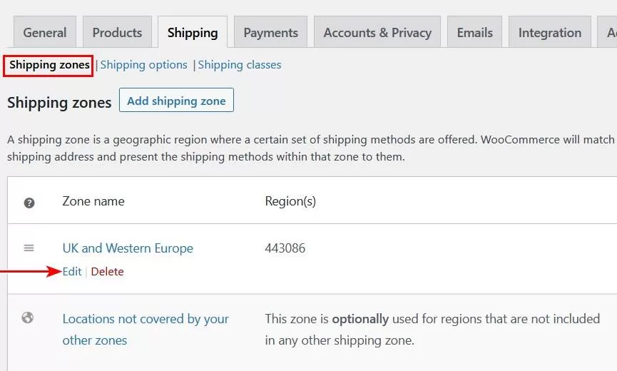 要做到这一点,请回到WooCommerce > Settings > Shipping > Shipping Zones,并在悬停在任何现有发货区上时点击编辑。