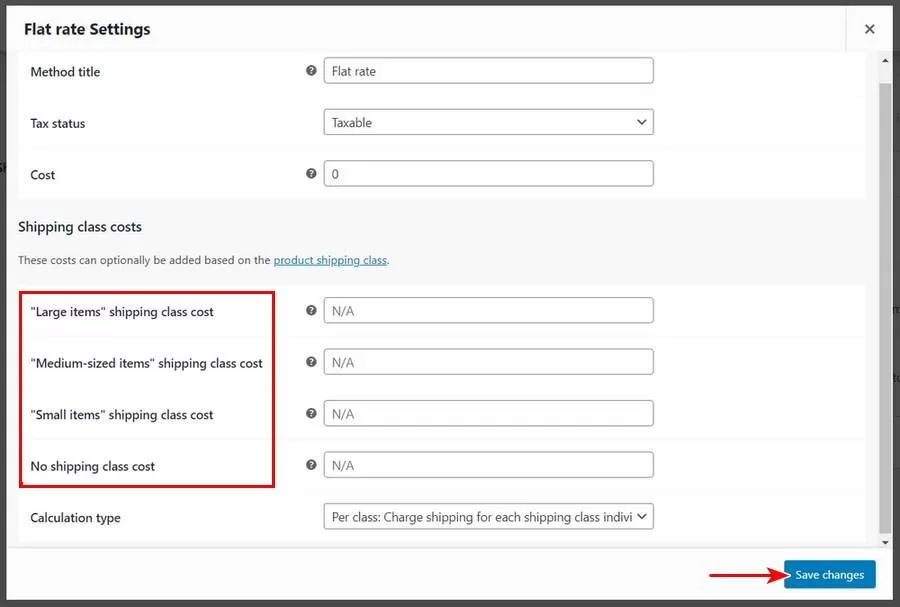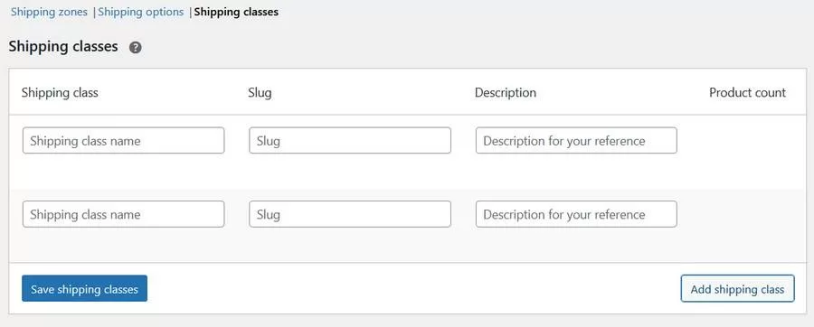 你可以通过多次点击Add shipping class按钮来添加多个航运类别。之后,单击 “Save shipping classes” 来保存你的进展。