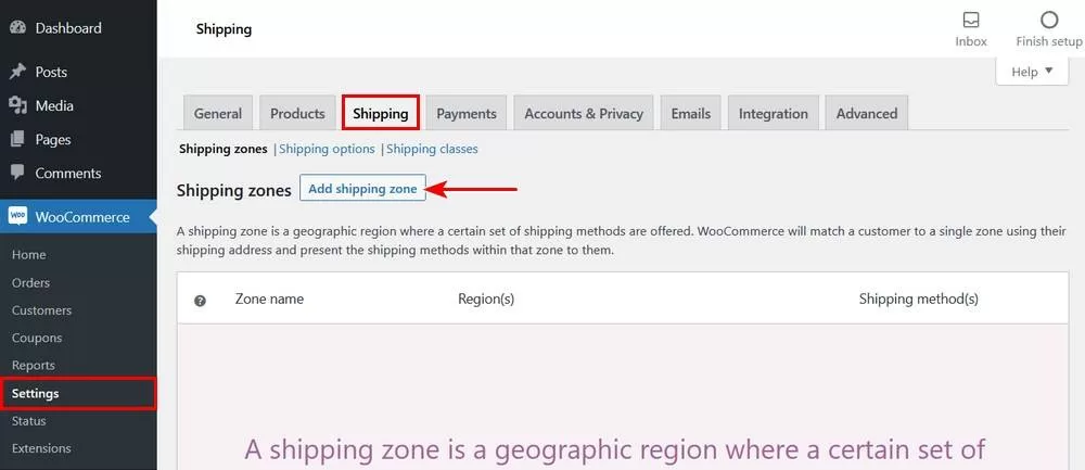 要创建你的第一个WooCommerce发货区,你所需要做的就是导航到WooCommerce > Settings > Shipping,然后点击Add shipping zone。