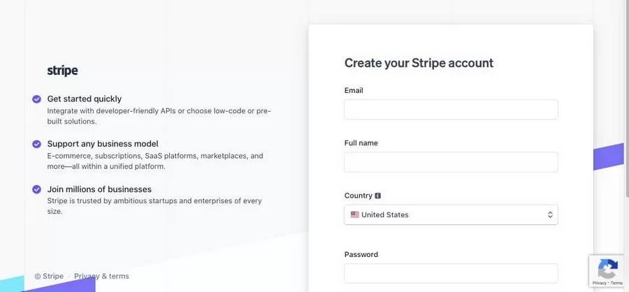 最后,你需要在Stripe本身创建一个账户。要做到这一点,请访问Stripe.com。填写相关信息并创建账户。