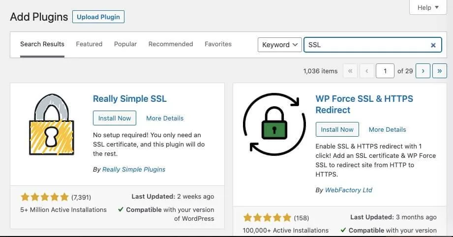 你想要的插件将是第一个结果,即Really Simple SSL。点击立即安装,然后启用,一旦该插件加载完毕。