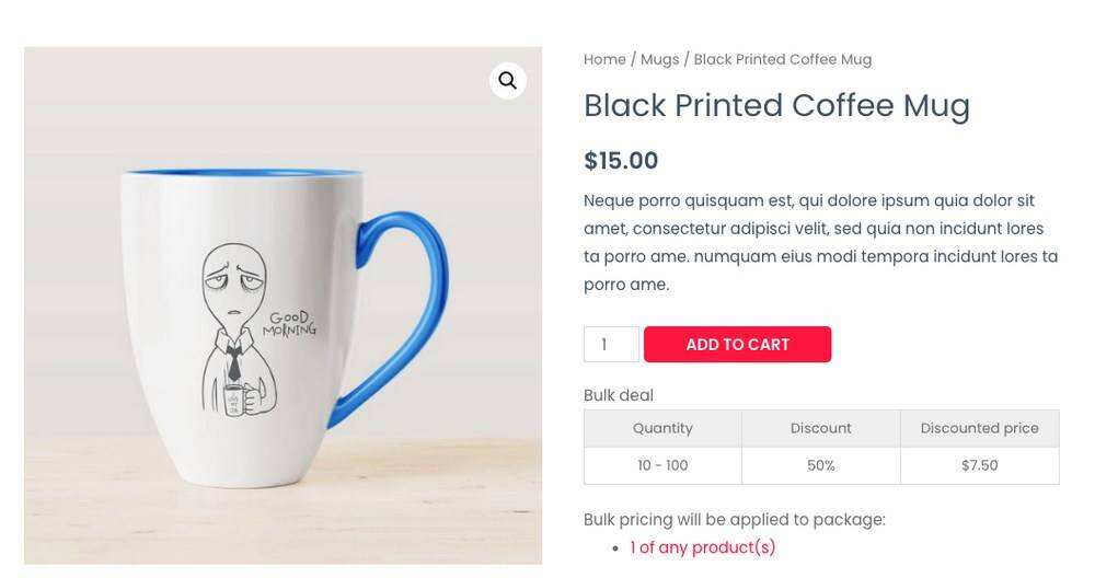 产品页面将显示一个批量交易框,表明我们刚刚设定的价格和折扣,如上图所示。