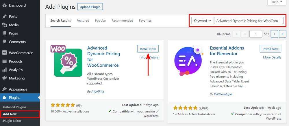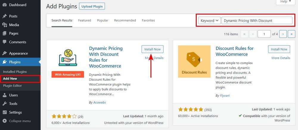 进入插件>安装插件,安装并激活Dynamic Pricing With Discount Rules for WooCommerce插件。