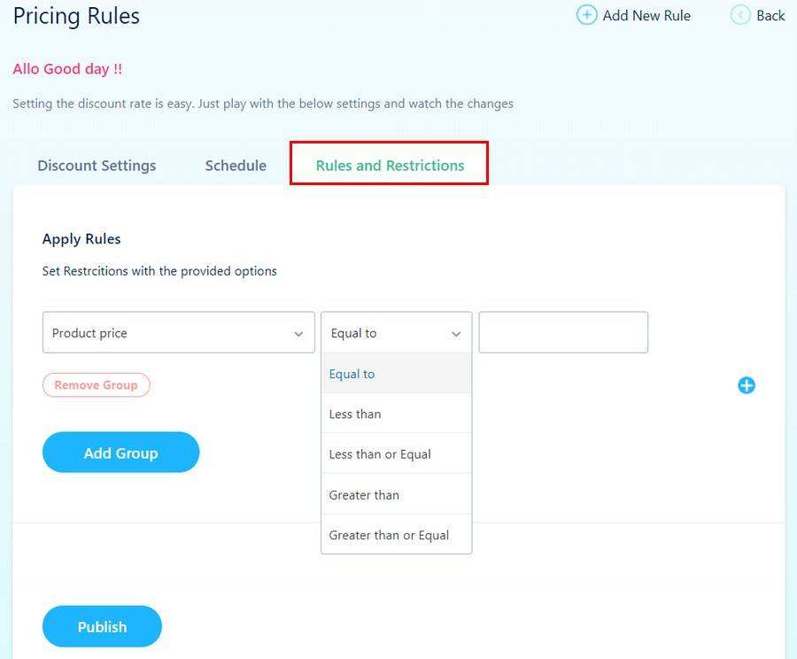 例如,如上图所示,你可以创建一个规则,根据预定义的条件对产品价格应用折扣。同样地,规则也可以应用于购物车。
