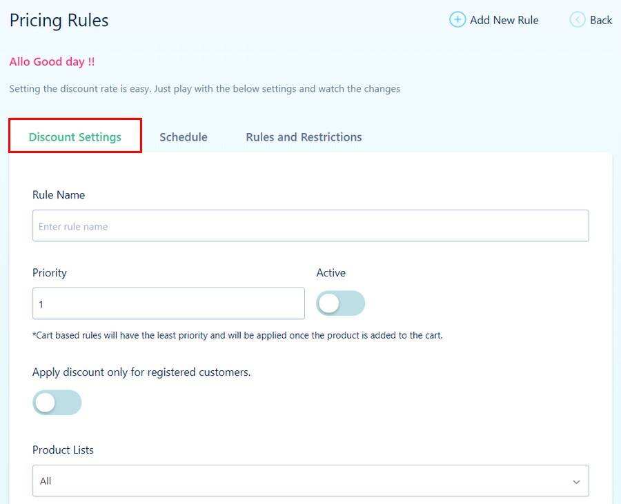 你首先在 “Discount Settings” 标签下创建一个规则名称。你可以设置一个优先级并激活它。