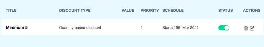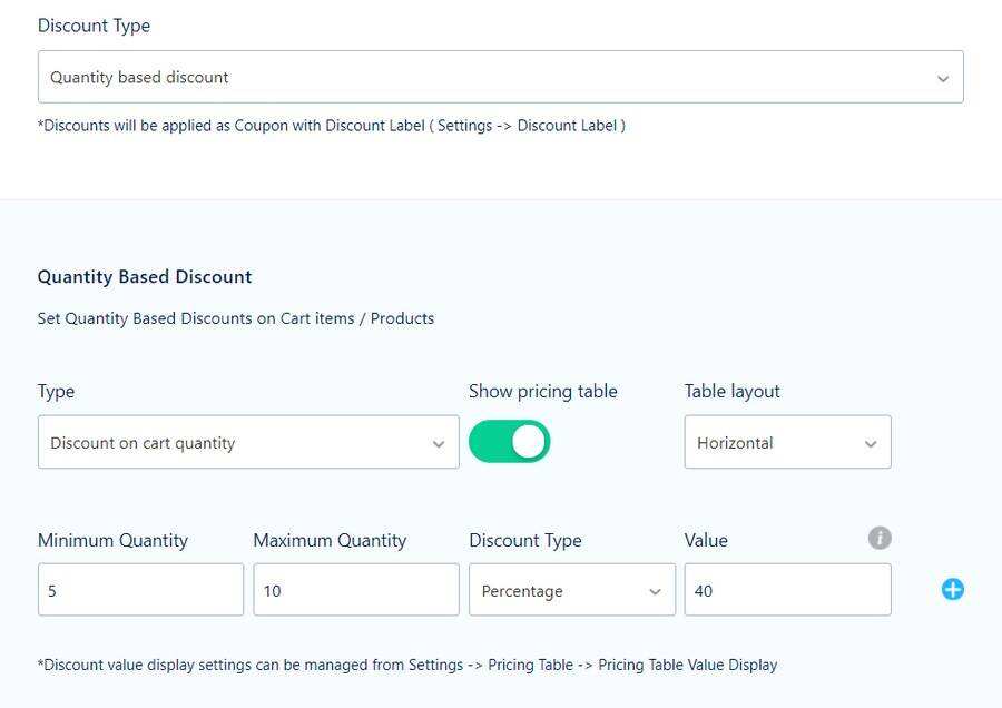 - 你可以选择根据数量、价格、总单位、重量和物品数量来设置折扣规则。