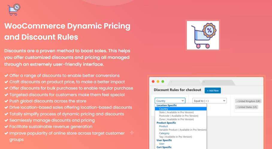 这个插件的目的是为店主充当独立的动态价格和折扣调节器一次。它使你能够按地点、产品细节、用户细节、购买历史、购物车细节、支付类型和运输细节配置折扣或动态定价规则。从本质上讲,它提供了你需要的工具,以全面控制你的商店的定价和折扣。
