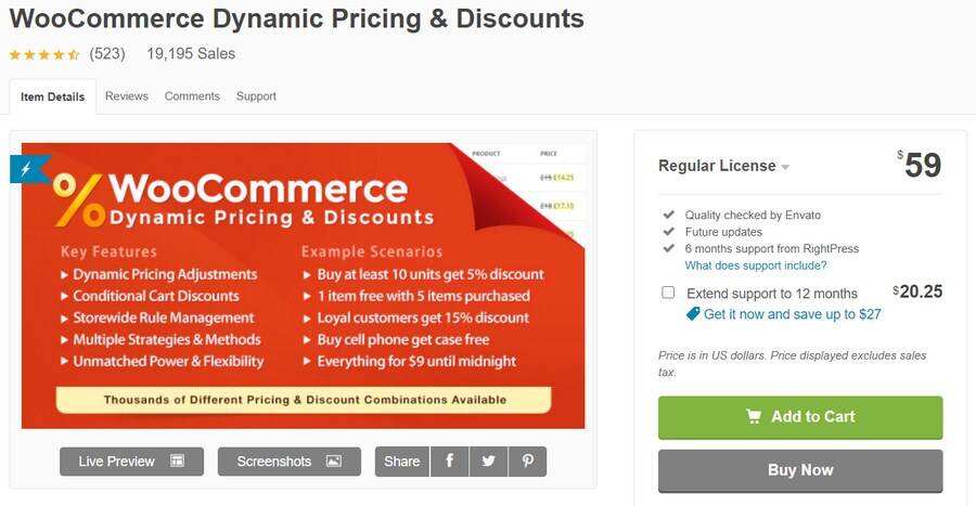 RightPress的动态定价和折扣在Codecanyon上有售,一次性费用为59美元。