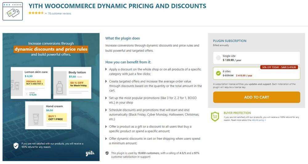 如需完整的列表,请查看YITH动态定价和折扣的WooCommerce功能。YITH Dynamic Pricing and Discounts for WooCommerce是一个高级插件,单个网站的授权费用为每年139美元。