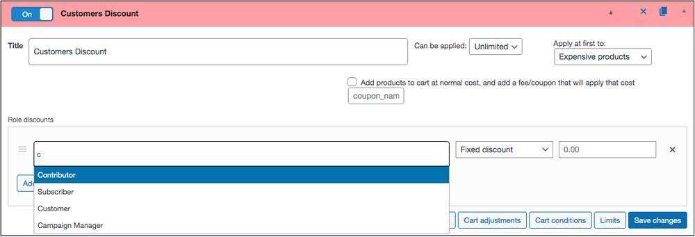 要创建一个基于用户角色的规则,只需点击WooCommerce > Pricing Rules > Add rule下的Role discounts。