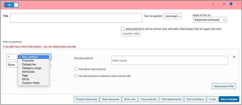 从可用的选项中,你可以选择产品、类别、标签、属性等等。你也可以通过排除某个特定的产品来进行具体操作。此外,你可以通过点击Add product filter,在同一规则中添加多个过滤器。