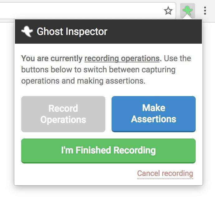 一旦你点击Start Recording,Ghost Inspector将开始记录你的行动,工具栏上的图标将变成绿色。此外,该扩展还记录Assertions。