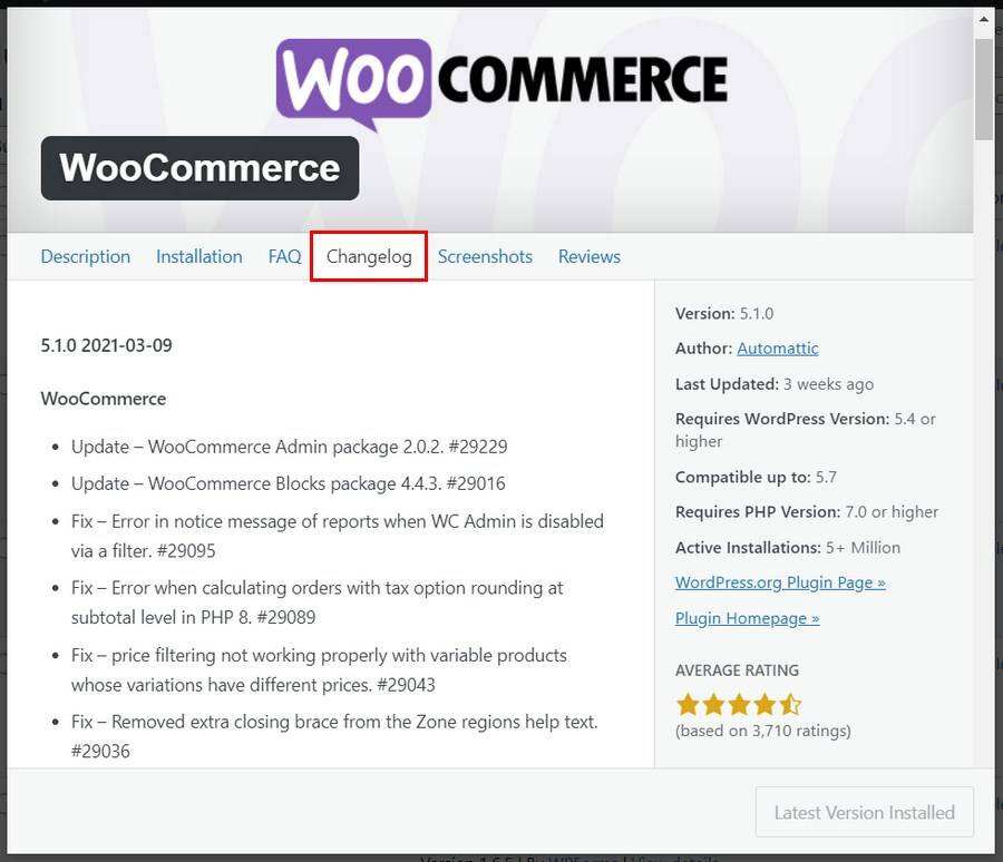 第一步是检查WooCommerce插件的版本细节。你是否安装了最新的版本?请到WordPress仓库,交叉检查你是否安装了最新的版本。