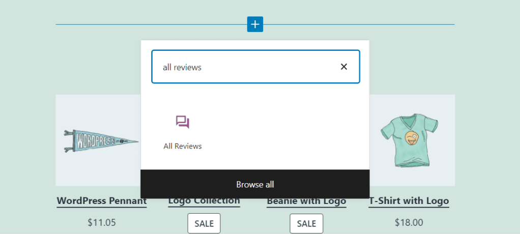 要使用此区块,请打开要展示评论的页面或文章的区块编辑器。选择添加新区块的选项,然后使用搜索工具查找所有评论(all reviews) 选项: