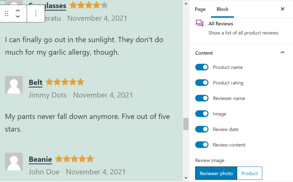 当您使用All Reviews区块时,您无法按产品或分类过滤评论。但是,该区块确实使您能够选择将显示哪些订单评论。