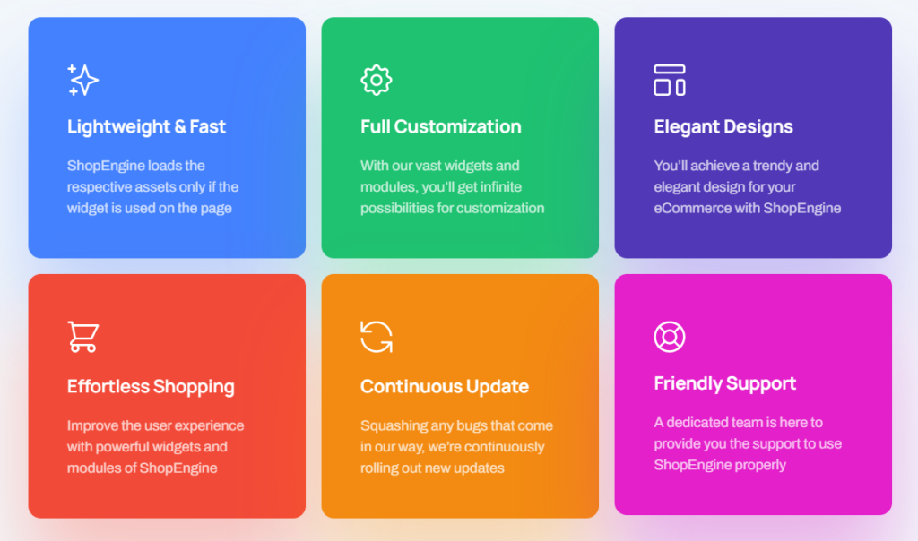 ShopEngine提供大约70个小工具,而WooLentor提供76个小工具。尽管就数量而言,WooLentor拥有更多功能,但您实际上可以集成与WooLentor相同的功能。