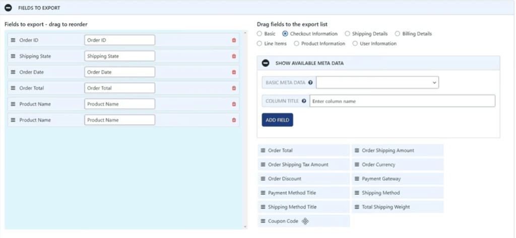 使用Fields to Export ,您可以使用拖放方法快速更改export上的数据库表列名称及其顺序。