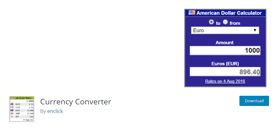 Currency Converter可从WordPress网站或仪表盘下载,并且有超过2000次活动安装。