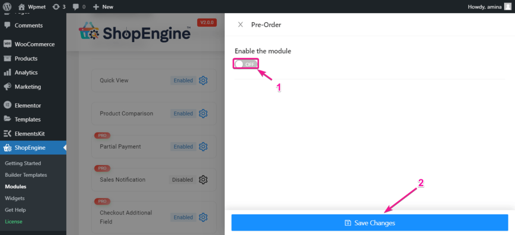 首先,要使用ShopEngine添加预售,您需要启用其预售模块。为此,请访问您的管理仪表盘并将鼠标悬停在ShopEngine上。然后,按下模块并像图像一样启用模块。
