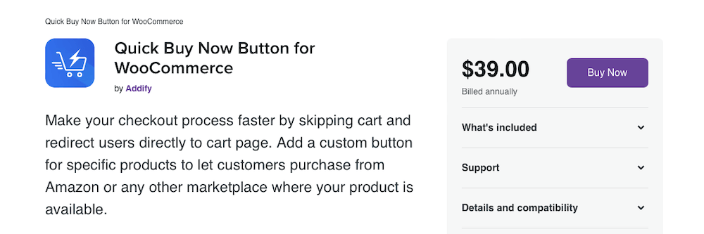 然后是Cashier WooCommerce插件,它添加了多种方法来加快您在线商店的结账过程。它为初学者添加了直接结账、一键结账和“立即购买”按钮。