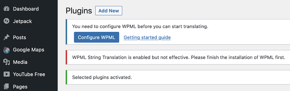 从这里,您可以开始更改设置以创造最佳体验。如果您从Plugins > Installed Plugins屏幕激活插件,您会在屏幕顶部看到一个配置WPML的链接: