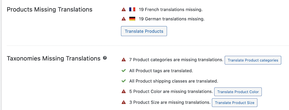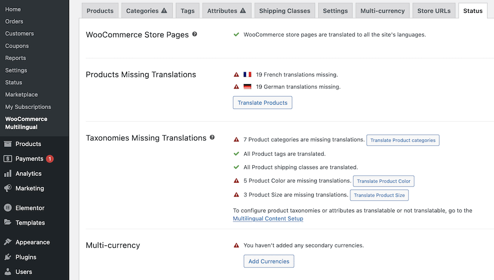 在您完成这两个向导之后,您的翻译可能会有更多工作要做。WooCommerce > WooCommerce Multilingual > Status页面将显示您需要处理的内容: