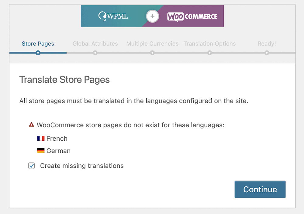 这里有四个步骤,第一个步骤涉及为您选择的语言创建商店页面。该对话框将让您知道哪些不存在,并让您选择创建它们:
