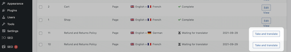 单击Send all items for translation后,将为翻译准备内容,您可以在WPML > Translations屏幕上查看状态:
