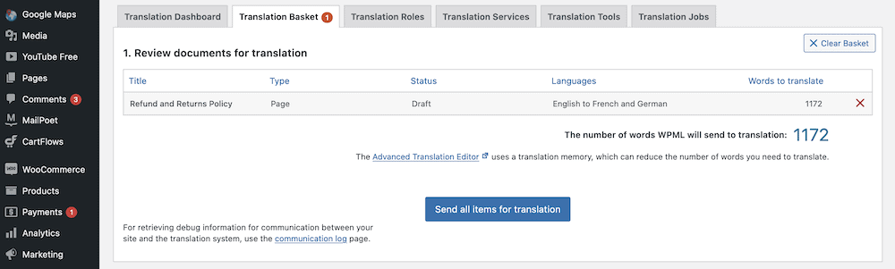 要执行自动翻译,请前往您的Translations Dashboard,然后检查您想要添加到“Basket”的文章和页面。Translation Basket选项卡将向您显示队列中的内容: