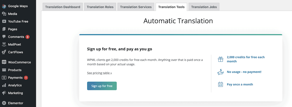 如果您单击Sign up for free按钮,然后填写字段,您将注册自动翻译。请注意,您每月确实可以获得一些免费积分,但这是一项高级服务。