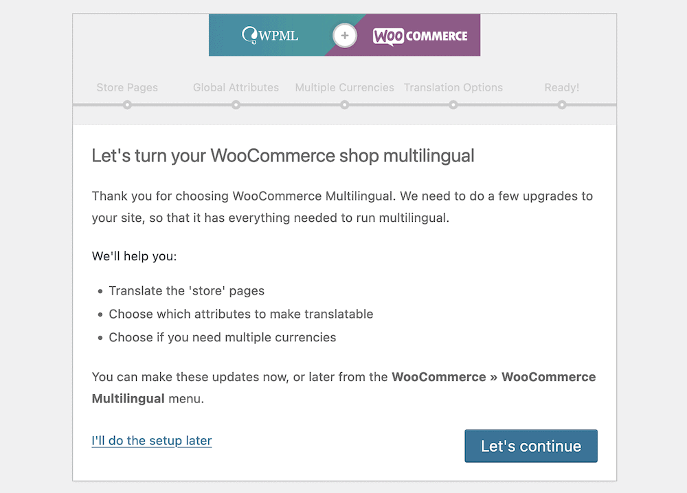 - 建议。这是最后一步,如果您需要启用某些组件(在我们的WooCommerce多语言案例中),您将在此处看到执行此操作的通知。