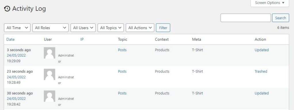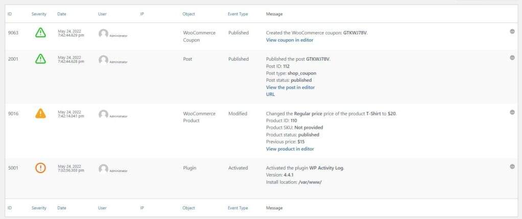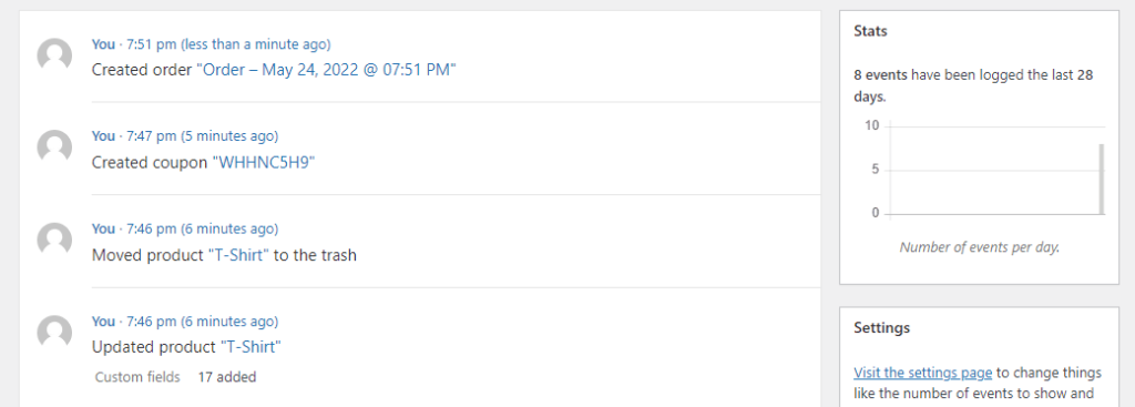 恰当命名的Activity Log插件旨在监控核心WordPress活动以及包括WooCommerce在内的多个插件。它经过了很好的优化并使用了自己的数据库表,因此您不会注意到任何减速。