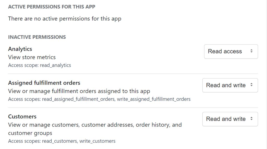 向下滚动到权限部分,并授予应用访问列表中所有权限的权限。您将在可用时使用“Read and write”选项,或者如果前者未显示,则仅使用Read access权限: