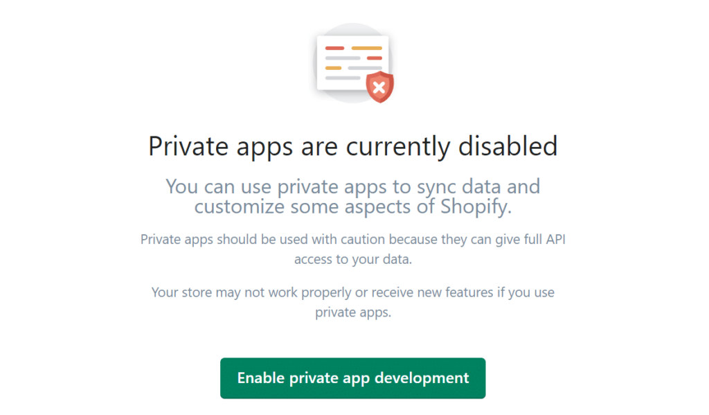 如果您尚未在Shopify中启用私有应用程序开发,您将看到如下所示的屏幕。单击Enable private app development按钮: