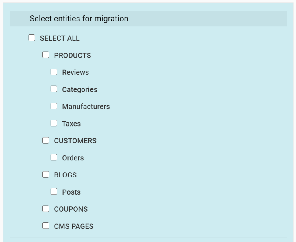 Cart2Cart需要一些时间来准备迁移过程。如果凭据正确,程序会询问您要将哪些数据从Shopify移动到WooCommerce: