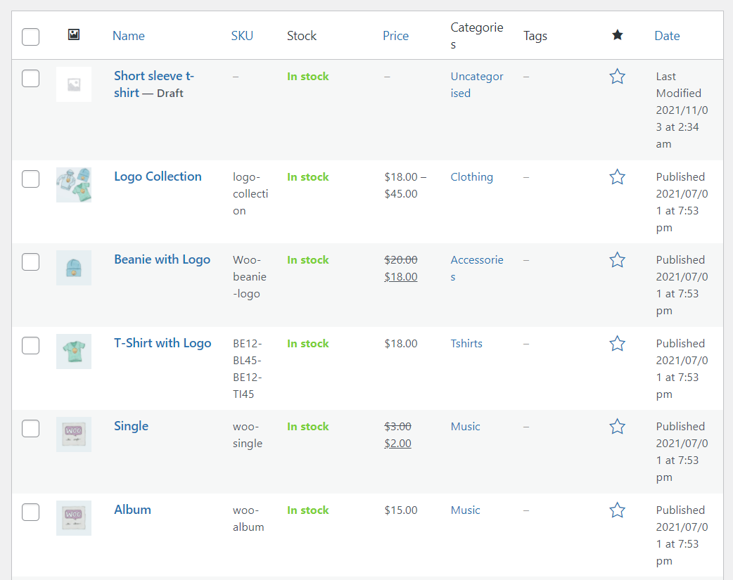 如果您单击View products,WordPress会将您发送到Products > All Products选项卡。在这里,您将看到刚刚导入的所有项目的概览: