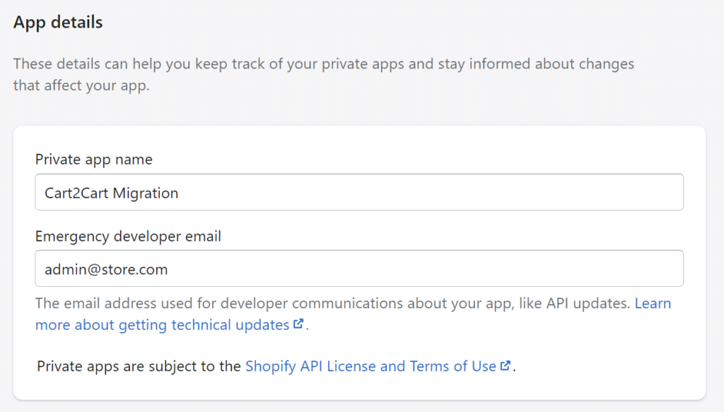 创建私有应用程序将生成Cart2Cart访问Shopify和导出数据所需的API密码。