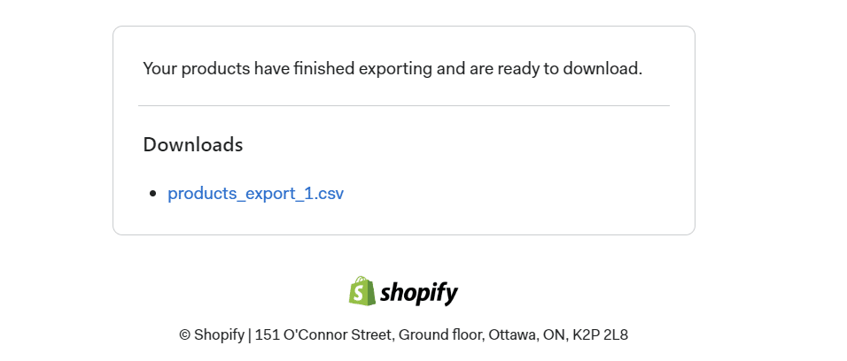 单击Export products后,Shopify将编译一个包含您所有产品数据的CSV文件,并通过电子邮件发送给您。该电子邮件可能需要一段时间才能到达,具体取决于您的库存量: