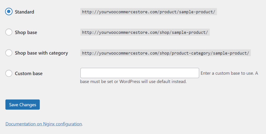 要更改商店的URL结构,请转到设置> 固定链接> 产品固定链接并选择您喜欢的选项: