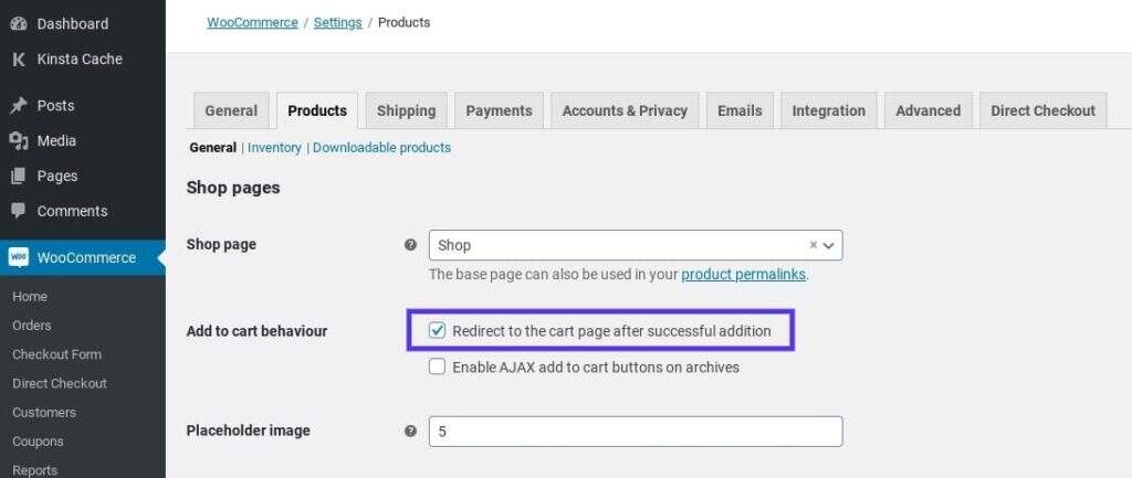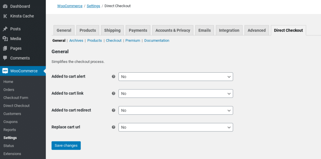 在General选项卡下, 为已Added to cart redirect选项选择Yes,然后从Added to cart redirect to下拉菜单中选择Checkout。完成后单击保存更改 。