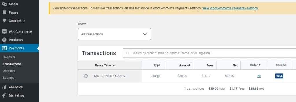 安装并激活插件后,您可以启用“Test Mode”。为此,请导航到WooCommerce > Payments > Settings: