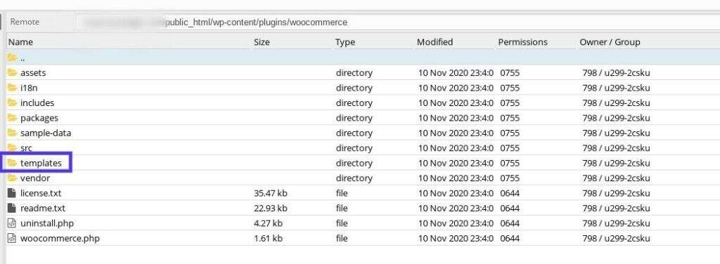 您可以在/woocommerce/templates下找到WooCommerce模板文件。从您网站的根目录,您需要导航到wp-content/plugins/woocommerce: