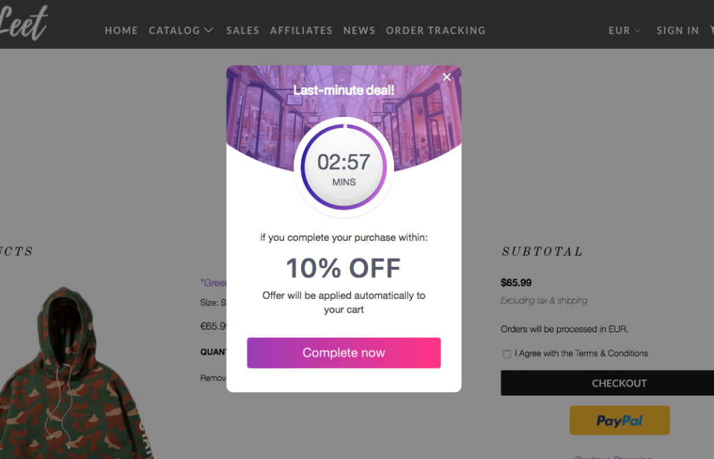 例如,这家在线商店通过使用Beeketing for WooCommerce插件添加倒数计时器来触发您的报价。带有倒计时的优惠会告诉购物者,如果他们想利用这笔交易,那么他们必须迅速采取行动。