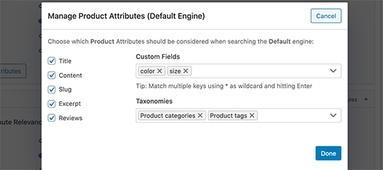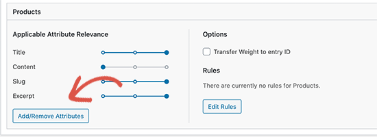默认情况下,插件将查看产品标题、内容(描述)、slug 和摘录(简短描述)以进行匹配。您可以通过单击“Add/Remove Attributes”按钮来扩展它。