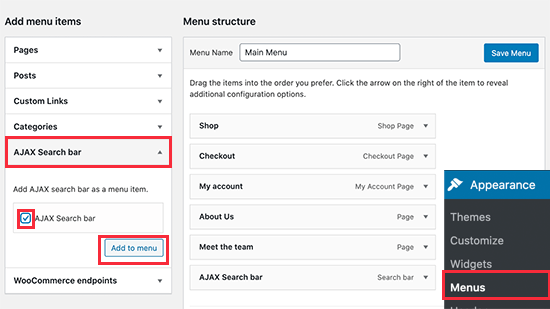 只需转到外观»菜单页面。确保选择了您当前的导航菜单,然后将“AJAX Search Bar”添加到您的导航菜单。