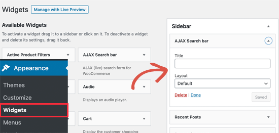 只需转到外观 » 小工具页面并将“AJAX search bar”小工具添加到侧边栏。