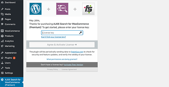 首先,您需要安装并激活Ajax Search for WooCommerce插件。激活后,您需要单击WordPress管理侧栏中的“Ajax Search for WooCommerce”菜单以输入您的许可证密钥。您可以在插件网站上的帐户下找到此信息。