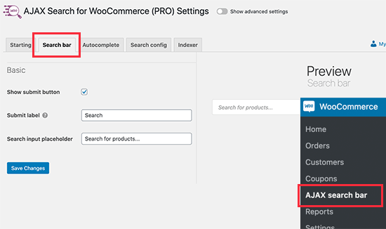 之后,您可以访问WooCommerce » Ajax Search Bar页面来配置插件设置。只需切换到“Search bar”选项卡即可开始使用。